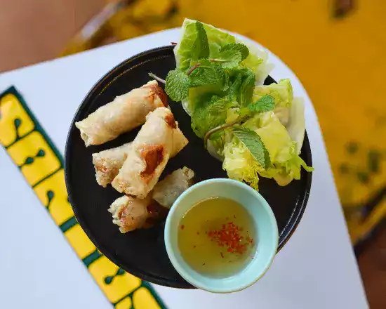 Vermicelles de riz, bœuf sauté aux oignons, nems légumes, soja, carottes, concombre, salade, cacahuètes et oignons frits