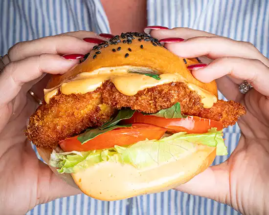 Pain bun, poulet panko, tomate, salade, sauce mayo sriracha, basilic thaï, frites de patates douces