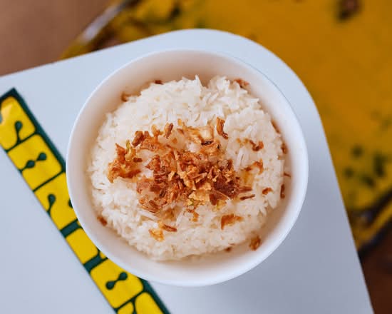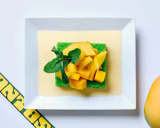 Riz vert, crème coco onctueuse et morceaux de mangue fraîche