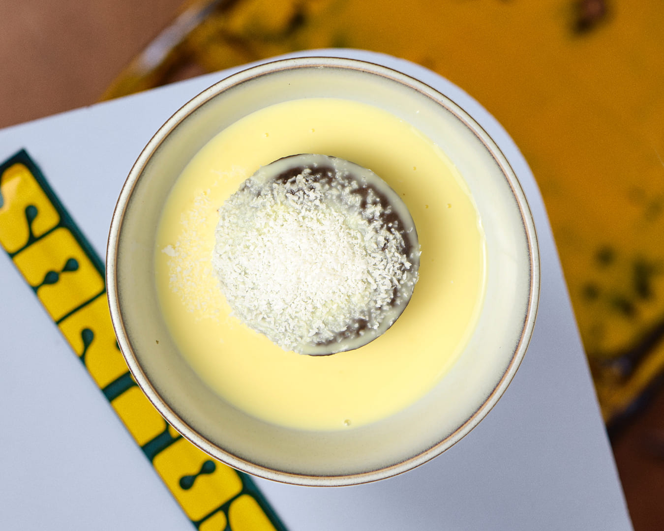 Moelleux au chocolat, crème anglaise et noix de coco râpée