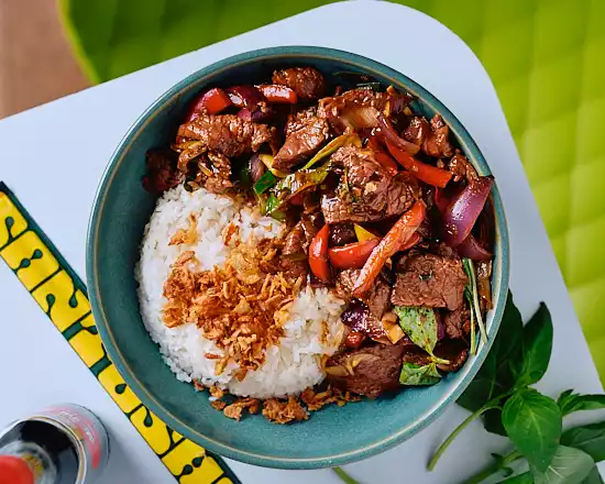Boeuf sauté au basilic thaï oignons rouges, poivrons rouges,poireaux, oignons frits, riz
