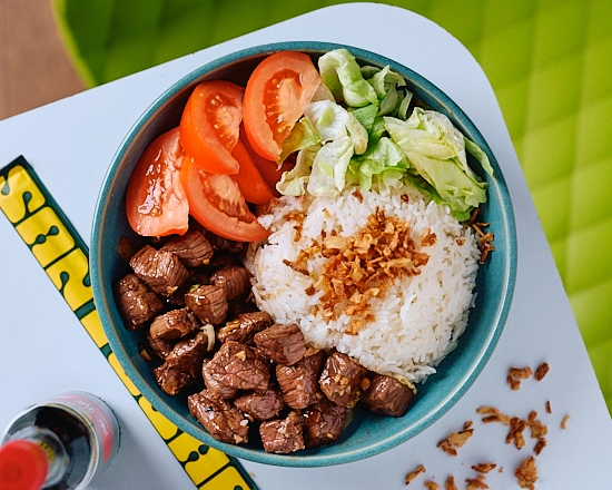 Dés de boeuf sautés au wok, salade, tomates, concombres, oignons, riz thaï, sauce lok lak