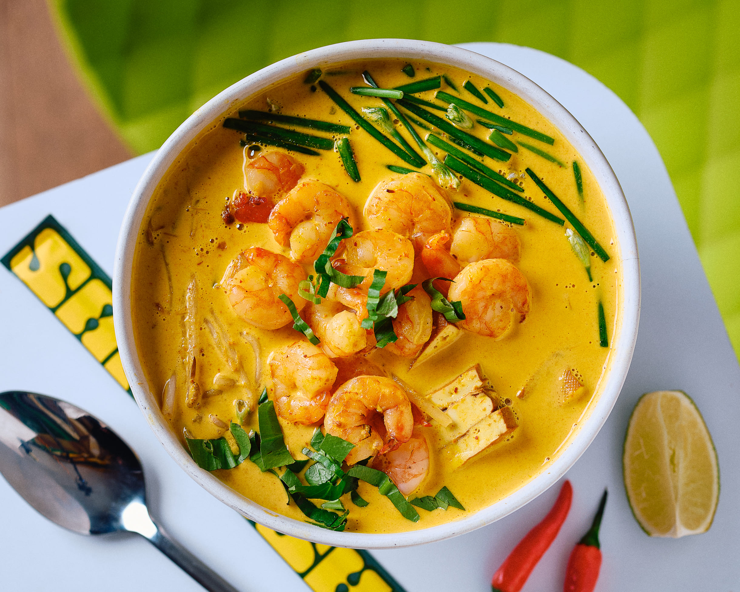 Nouilles aux oeufs, curry, curcuma, crevettes, lait de coco, soja, tofu, oeufs, poisson, soja, graines de sésame