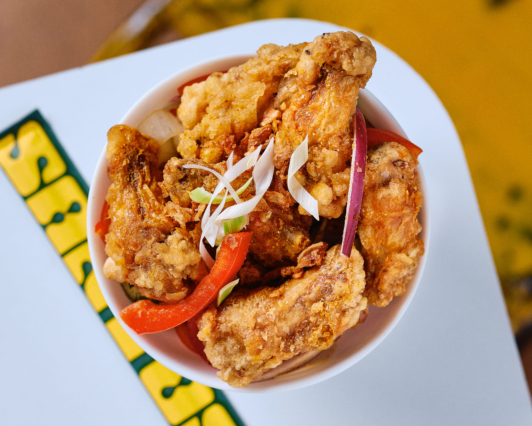 Poulet croustillant, riz, oignons frits, sauce caramélisée