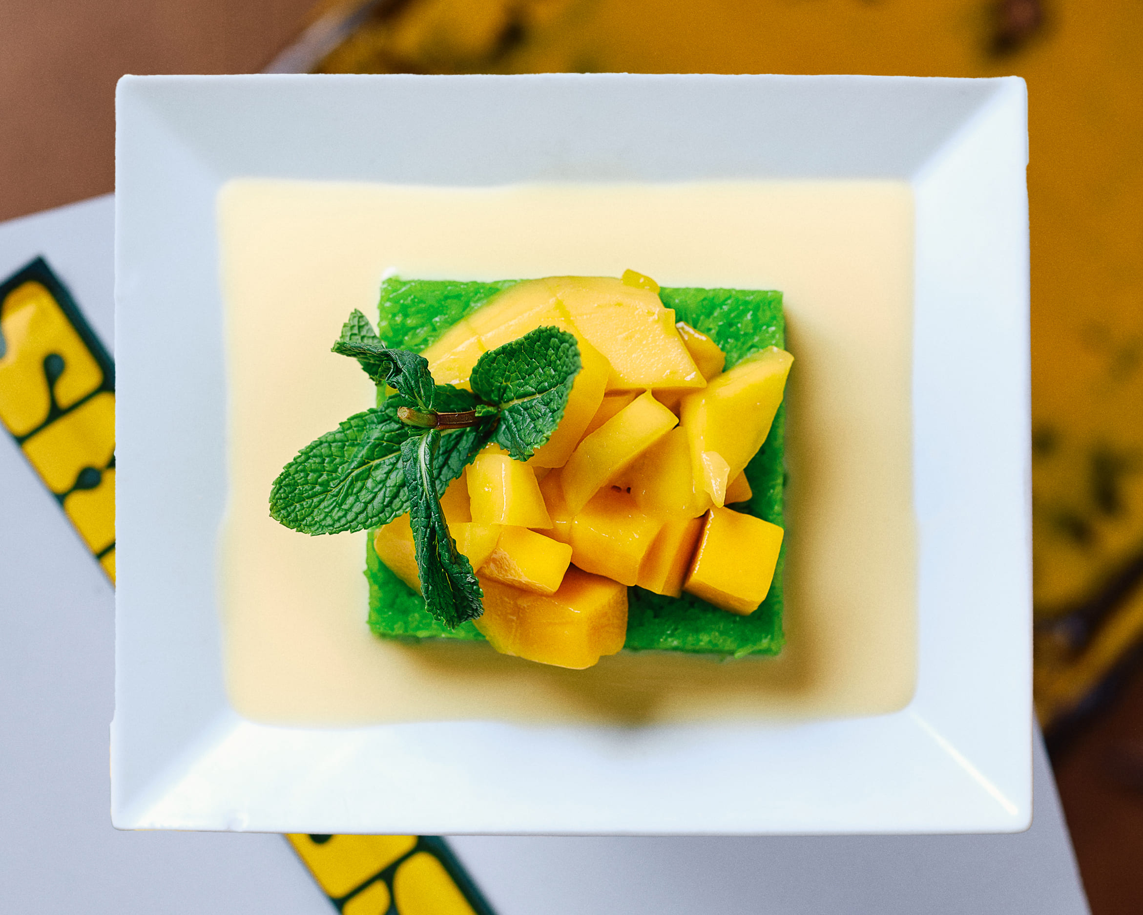 Riz vert, crème coco onctueuse et morceaux de mangue fraîche